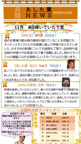 スタッフの頑張りをしっかり見つめて、毎月スタッフを表彰!あした葉では、スタッフの頑張りや素晴らしい接客、お客様に喜ばれたエピソードを毎月【社内報】という形で全スタッフに共有しています。11月号がコチラ★社員一人ひとりの努力に光を――毎月の「...