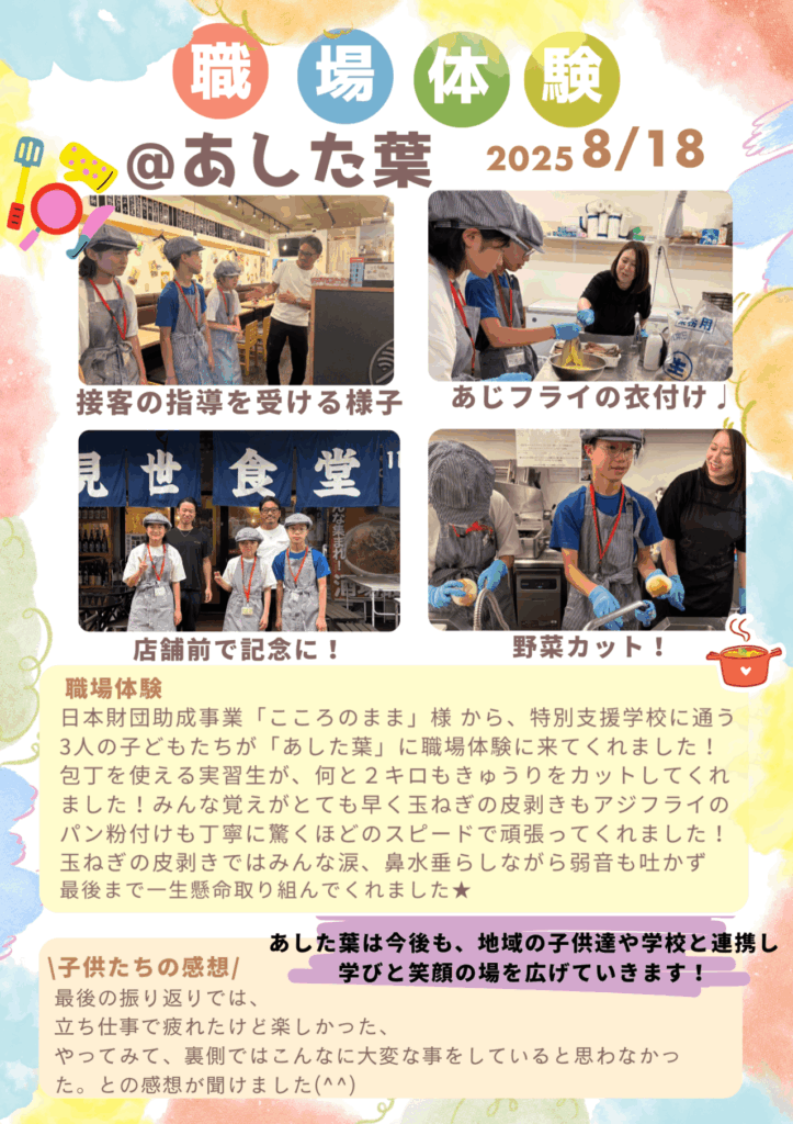 地域に寄り添う「あした葉」の子ども食堂――沼津市の広報に掲載されました!2025.07.10大衆酒場 たばちゃん 仲見世店このたび、私たち株式会社あした葉の取り組みが、沼津市発行の「広報ぬまづ」にて紹介されました。私たちは、地域の子どもたちが安心して集える場所として、子ども食堂を運営しています。今回の記事では、実際の子どもたちの声や働いているスタッフさん方の声...続きはこちら