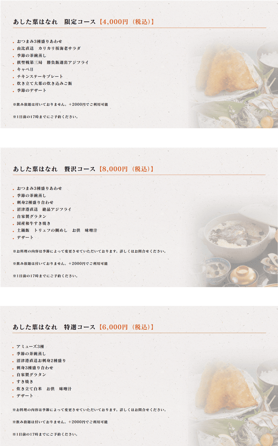 | ご予約 | 完全予約制 2名様から承ります |